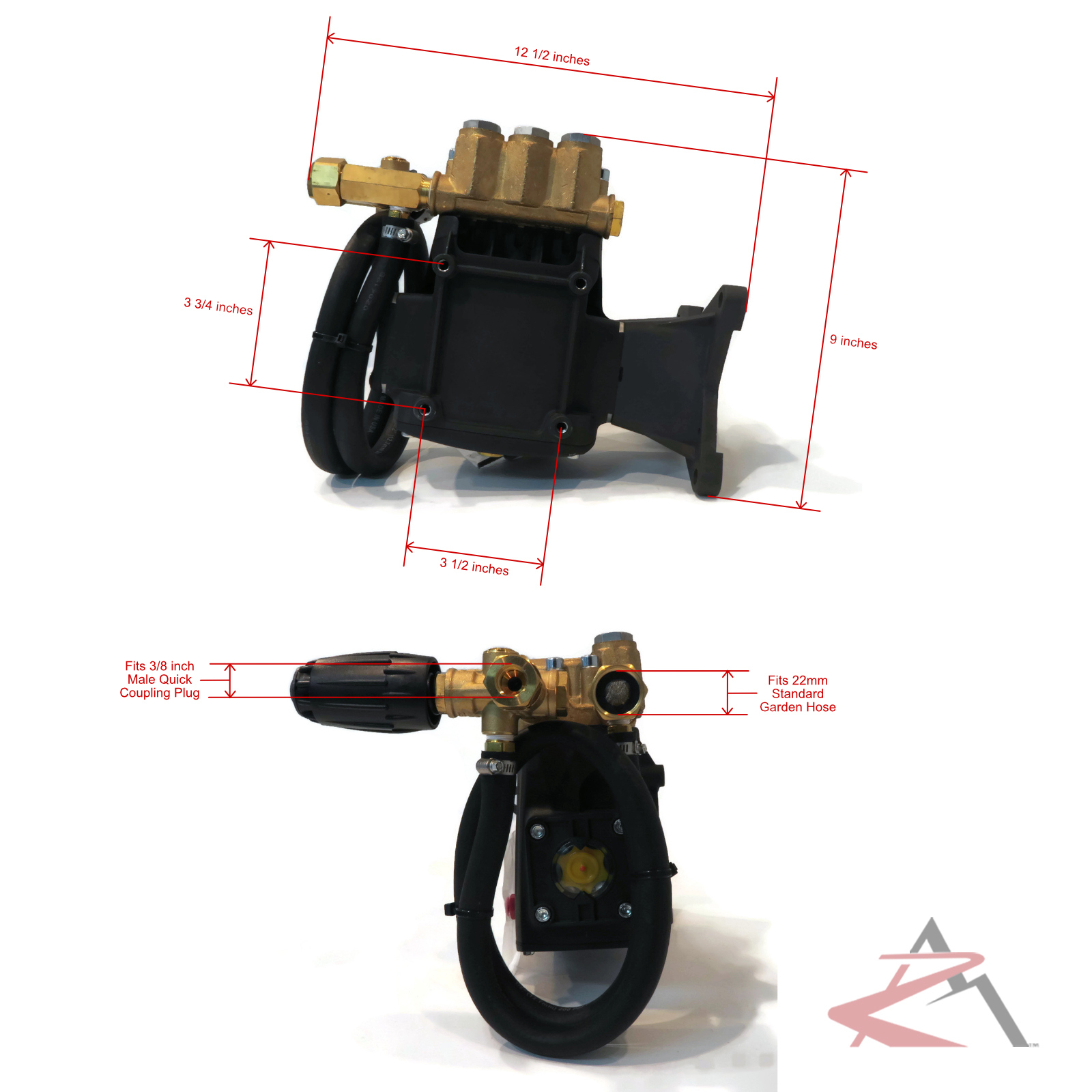- Includes - (1) Horizontal Brass Pressure Washer Pump, (1) Oil Cap, (4) Bolts & (4) Lock Washers; comes as shown in the first image (does NOT include engine shaft key)