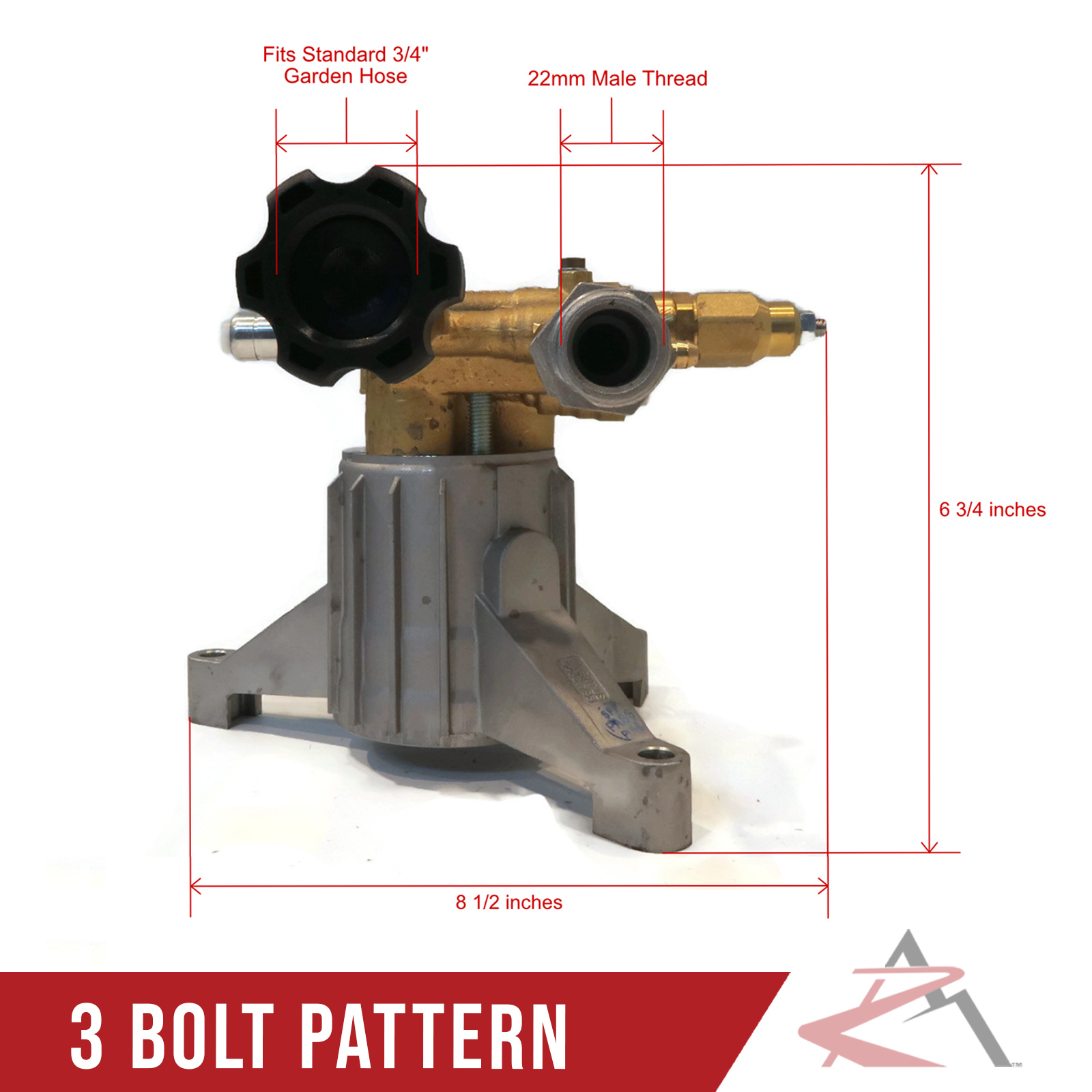 - Specs - Maximum Pressure: 2800 PSI. Maximum Flow: 2.5 GPM. Maximum Pump Speed: 3400 RPM. Shaft Size: 7/8". 3 Bolt Pattern: 7 11/16" x 6 3/16" x 6 7/16" & 4" from center to center of each outer hole. Maximum Fluid Temperature: 140 F. Inlet Type: 3/4" GHA. Outlet Type: 22mm x 14mm. Oil Capacity: 2.2oz. Refer to images 2 and 3 for more information