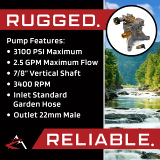 - Specs - Pump - Max Pressure: 3100 PSI. Max Flow: 2.5 GPM. Max Pump Speed: 3400 RPM. Shaft Diameter: 7/8" Shaft. 3 Bolt Pattern: 7 11/16” x 6 3/16” x 6 7/16” & 4" Center to Each Outer Hole. Max Water Temperature: 140° F. Inlet Connection Type: Standard Garden Hose. Outlet Tube Connection: 22mm Male. Chemical Hose - Inner Diameter: 1/4" (6mm). Outer Diameter: 3/8" (9mm). Length: 5'. Material: Rubber. Keyway - Overall Dimensions: 3/16" x 1/4" x 1 1/8"; Refer to images 2 and 3 for more information