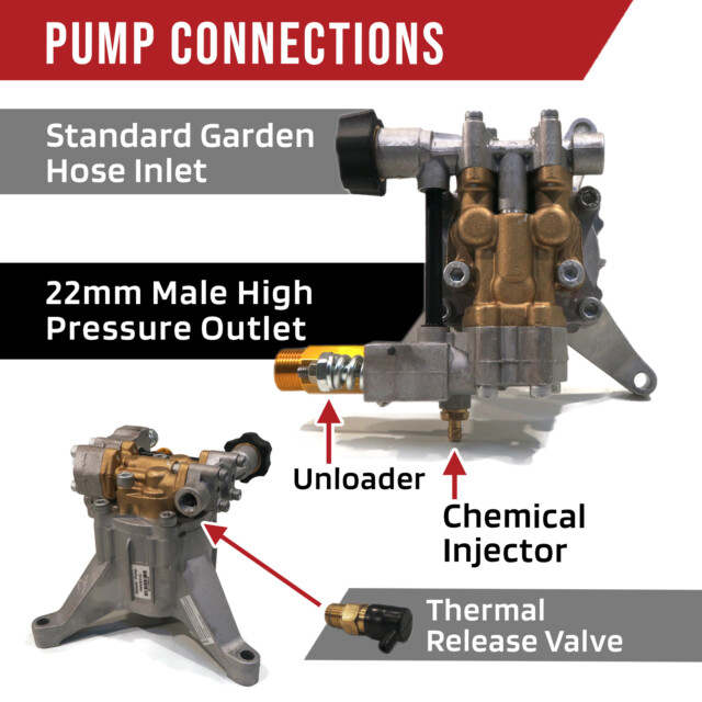 - Includes - (1) Pressure Washer Pump with Chemical Injector, Unloader Valve, Thermal Release Valve & Outlet Tube (all come installed), (1) Keyway and (1) Chemical Hose with Filter; comes as shown in the first image