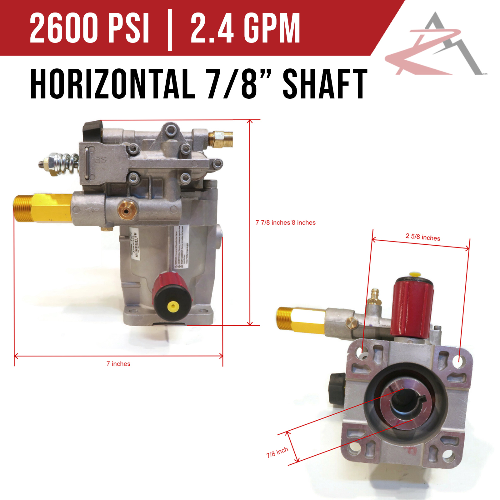 - Specs - Keyway - Overall Dimensions 3/16" x 1/4" x 1 1/8". Quick Connect - Male Pipe Thread: 3/8". Coupler End: 3/8". Max PSI: 4200. Pump - Max PSI: 2600. Max Flow: 2.4 GPM. Max RPM: 3400. Shaft Diameter: 7/8" Hollow Short Shaft. Bolt Pattern: 2 5/8" (Center to Center) & 1 7/8" (Center to Each Outer Hole). Max HP: 6.5. Inlet Connection Type: Standard Garden Hose. Outlet Tube Connection: 22mm Male. Oil Capacity: 75 mls (2.5 oz). Refer to images 2 & 3 for more information