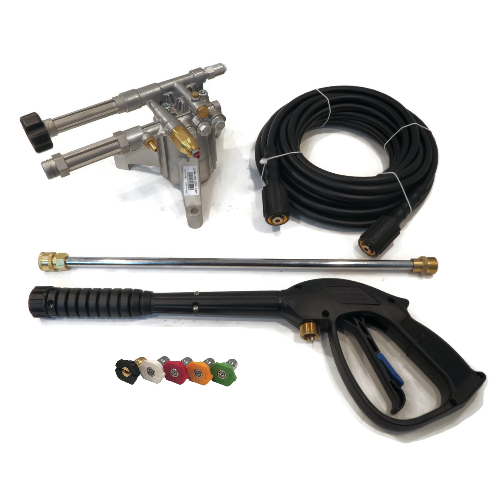 - Includes - (1) Pressure Washer Pump, (1) 35' Hose, (1) Spray Gun, (1) 18" Extension Lance, (1) 0° Spray Tip - Red, (1) 15° Spray Tip - Yellow, (1) 25° Spray Tip - Green, (1) 40° Spray Tip - White & (1) Soap/Chemical Spray Tip - Black; comes as shown in the first image