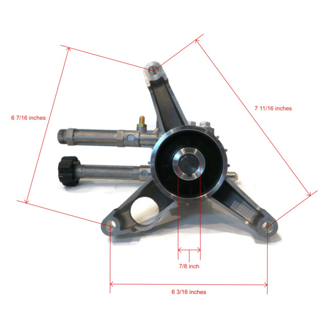 - Specs - Maximum Pump Pressure: 2400 PSI. Maximum Pump Flow: 2.2 GPM. Maximum Pump Speed: 3400 RPM. Shaft Size: 7/8". Pump 3 Bolt Pattern: 7 11/16" x 6 3/16" x 6 7/16" & 4" from center to center of each outer hole. Maximum Fluid Temperature: 140° F. Pump Inlet Type: 3/4" GHA. Pump Outlet Type: 22mm x 14mm. Oil Capacity: 2.2oz. Hose Length: 35'. Spray Gun Inlet: M22 Male. Spray Gun Outlet: M22 Female. Lance Length: 18". Lance Inlet: M22 MPT. Lance Outlet: 1/4" Female QC. Nozzle Size: 3.0. Nozzle Type: 0°, 15°, 25°, 40° & Soap. Refer to images 2 and 3 for more information