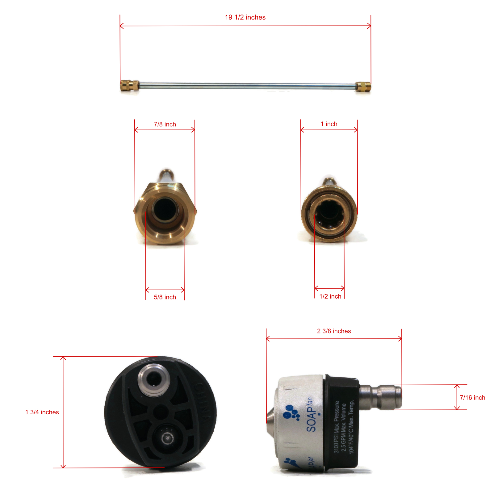 - Specs - Spray Gun - Inlet: M22 male. Outlet: M22 female. Max PSI: 3000. Max Temp: 140° F (60° C). Max GPM: 7. Wand - Male Pipe Thread Inlet: M22. Female Quick-Connect Outlet: 1/4". Max GPM: 10.5. Max PSI: 4000. Max Temp: 300° F (150° C). Hose - Length: 35'. End Types: M22 Female, Threaded. Diameter: 1/4" (6mm). Max PSI: 3200. Nozzle - Max PSI: 3100. Max GPM: 2.5. Max Temp: 104°F (40°C). Connection Type: 1/4" Male Quick-Connect. Refer to images 2 & 3 for more information