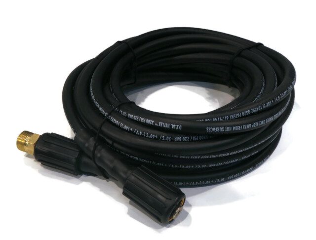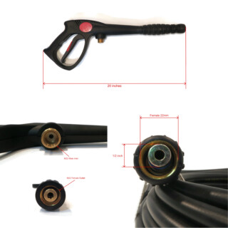 - The spray gun features easy access to the M22 male connector in front of the trigger and the M22 female threaded connection accepts wands with M22 connectors. The extension wand has a 1/4" Quick-Connect plug for fast swapping of standard accessories. The spray nozzle settings feature 0 degrees, 25 degrees, 40 degrees, Soap Jet & Soap Fan. The hose features high quality components, 3:1 burst to operating pressure, smooth thermoplastic cover, textile braided reinforcement, & seamless inner tube